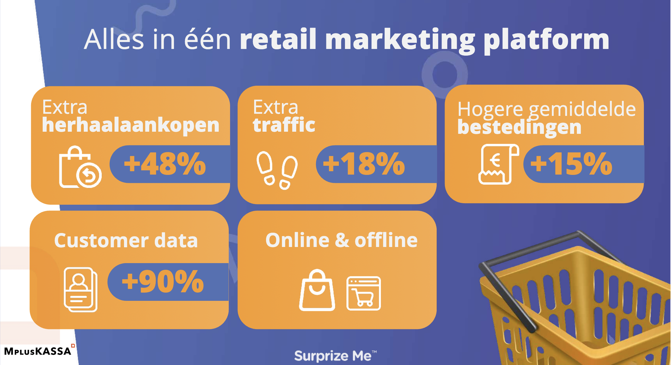 Het mooiste is: Surprize Me is volledig geïntegreerd in MplusKASSA. Met één druk op de knop begin je klanten te verrassen en geef je sales, loyaliteit en herhaalaankopen een stevige impuls. Gemiddeld leidt Surprize Me tot 10 tot 15% meer omzet.